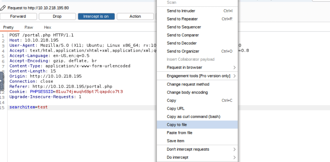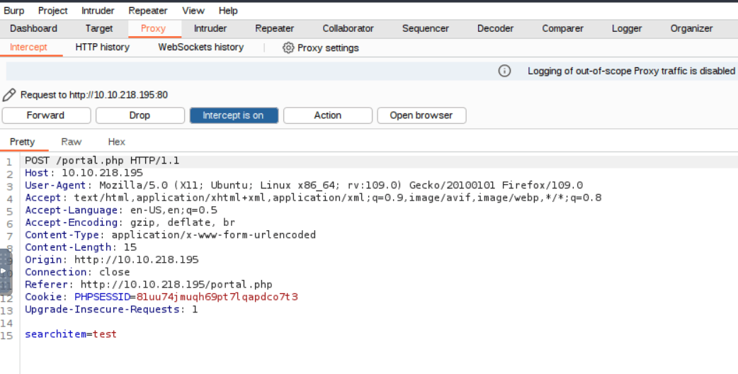 After logging in we reach a page with a search feature, type anything in the search box and capture the request with Burp.