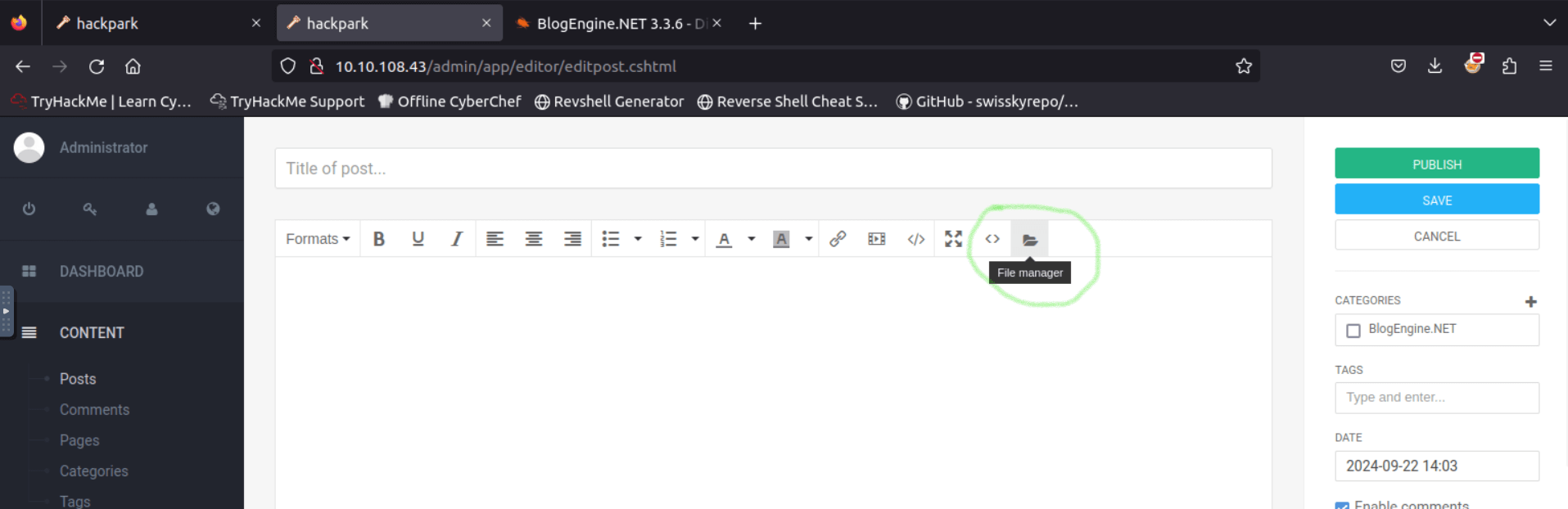 Go to http://10.10.108.43/admin/app/editor/editpost.cshtml
