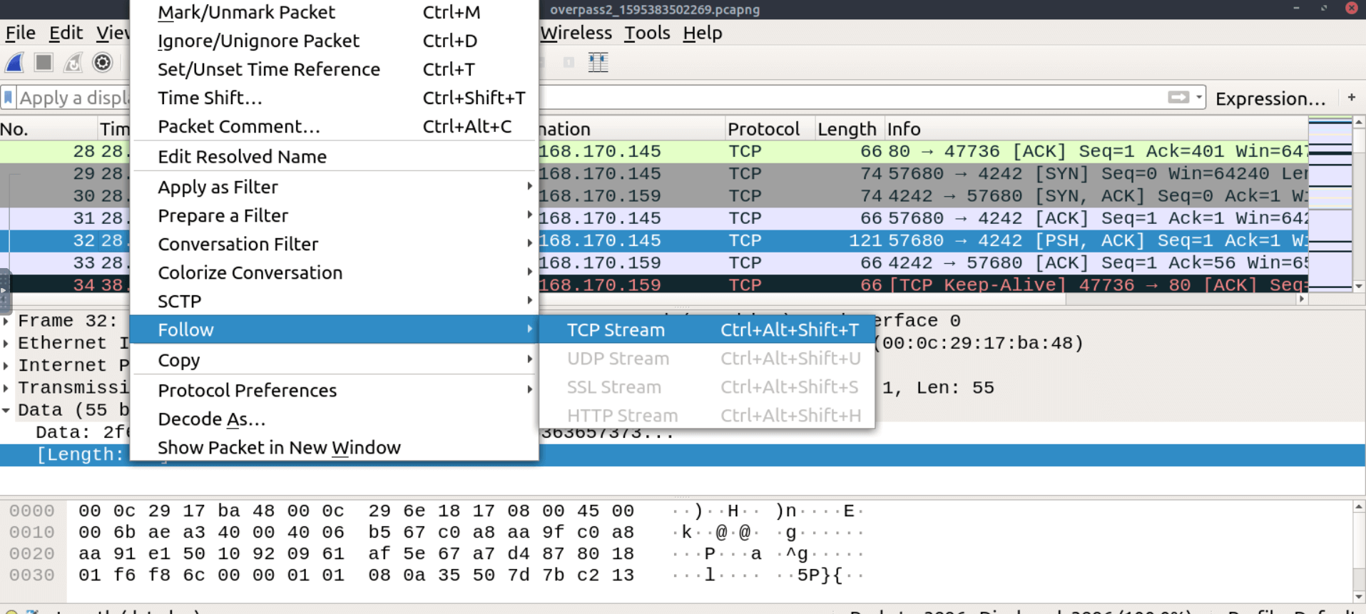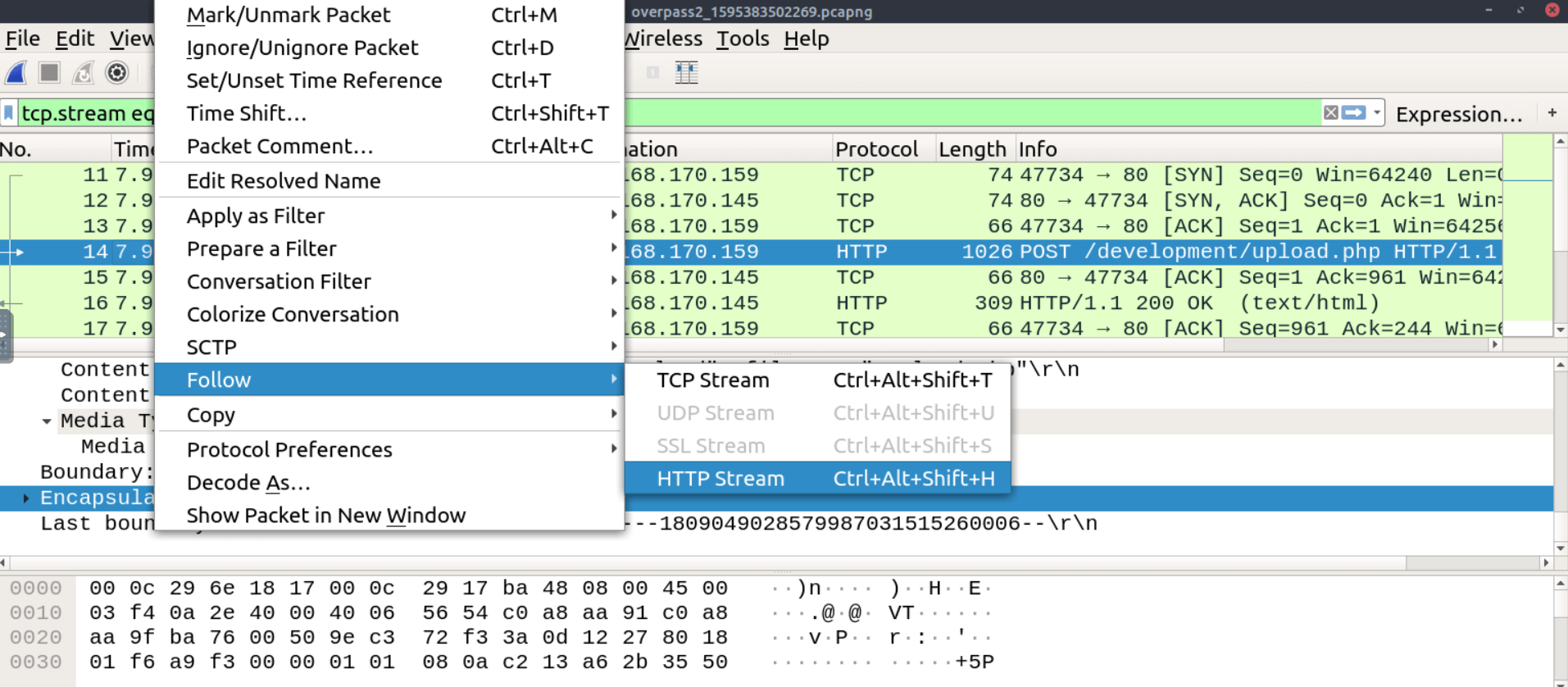 Looking at the packets one by one to reconstruct a network interaction can be overwhelming! Luckily you don’t have to: Wireshark offers a feature that allows you to “follow” the stream of related packets and visualize the whole interaction. So click on the packet and follow the http stream.