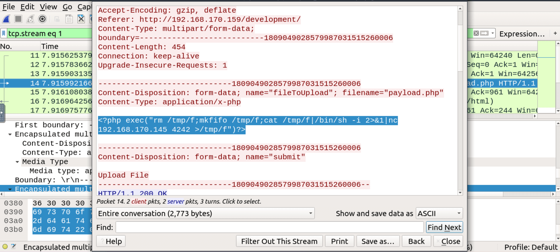 Examining the stream it becomes clear that the POST request was used to upload a file named payload.php. We can even see the content of the file in plain text, which is some php code to spawn a reverse shell (see image below).