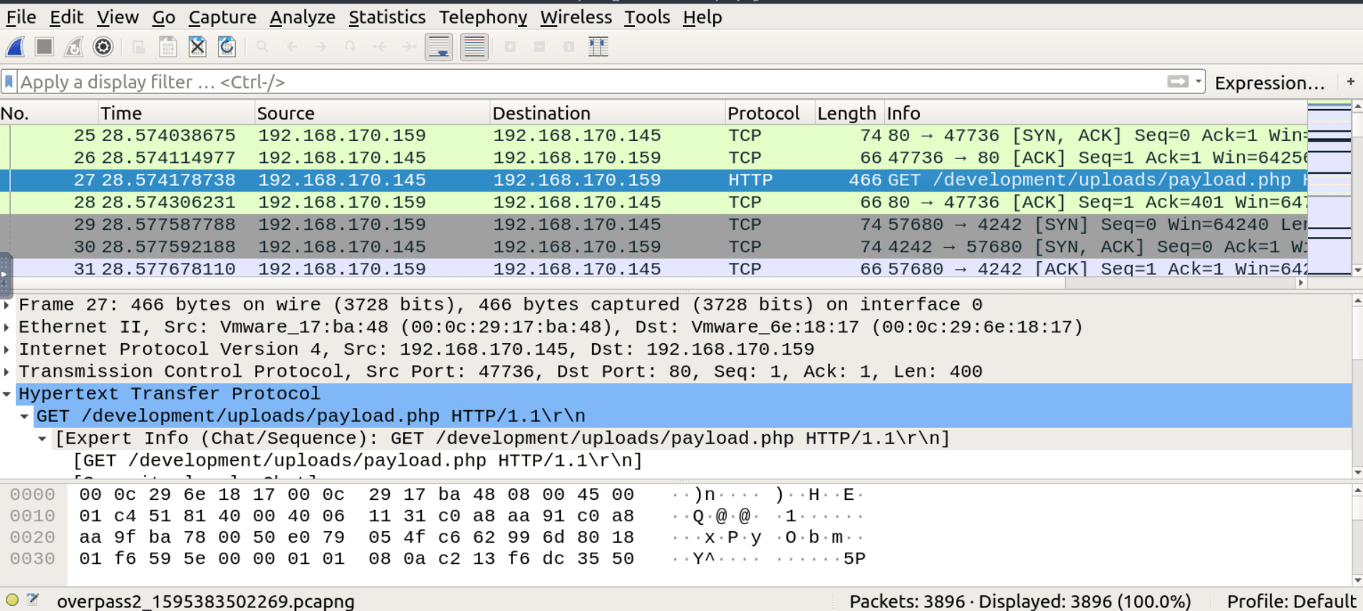 Keep scrolling down in the http packets and you will find the GET request that activated the payload.php payload.