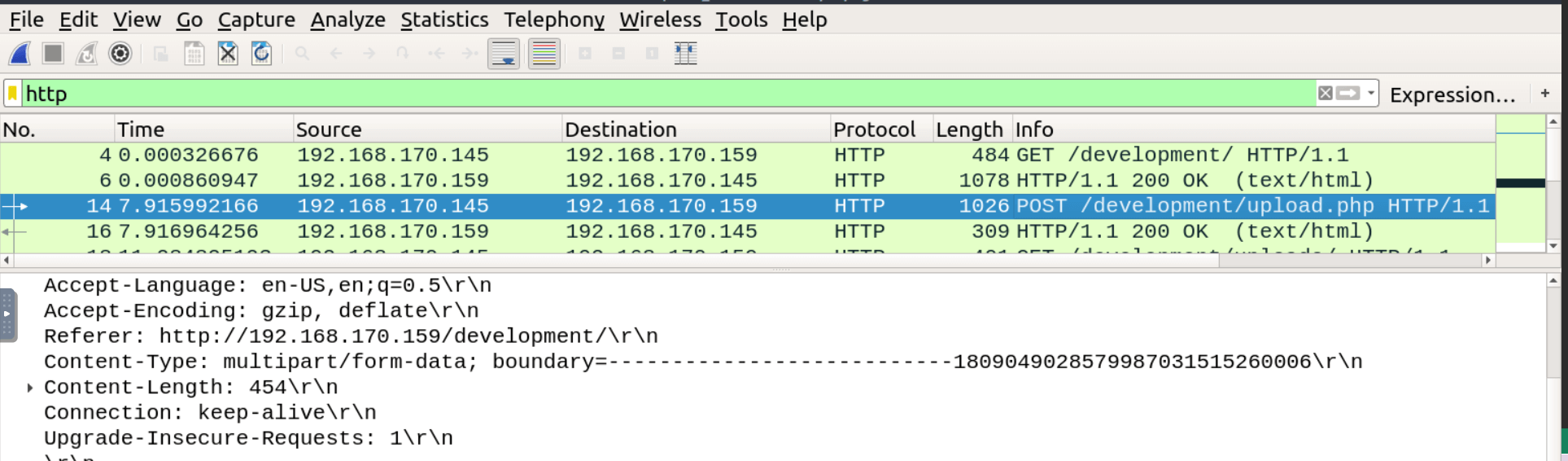 Filter for http packets and you will find a POST request to /development/upload.php.